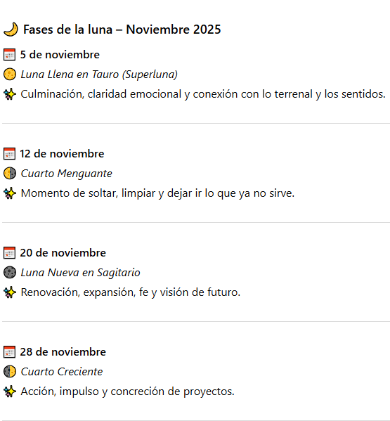 💫 Consejo lunar: guarda estas fechas en tu calendario. Observar la luna te ayuda a sincronizar tus emociones y energía con los ritmos naturales del universo.